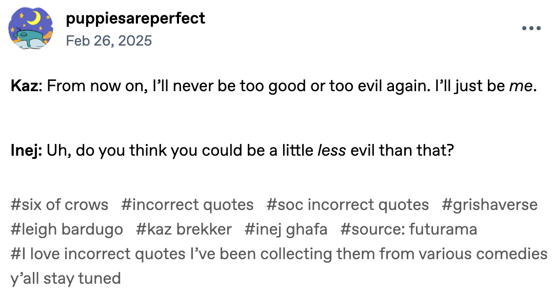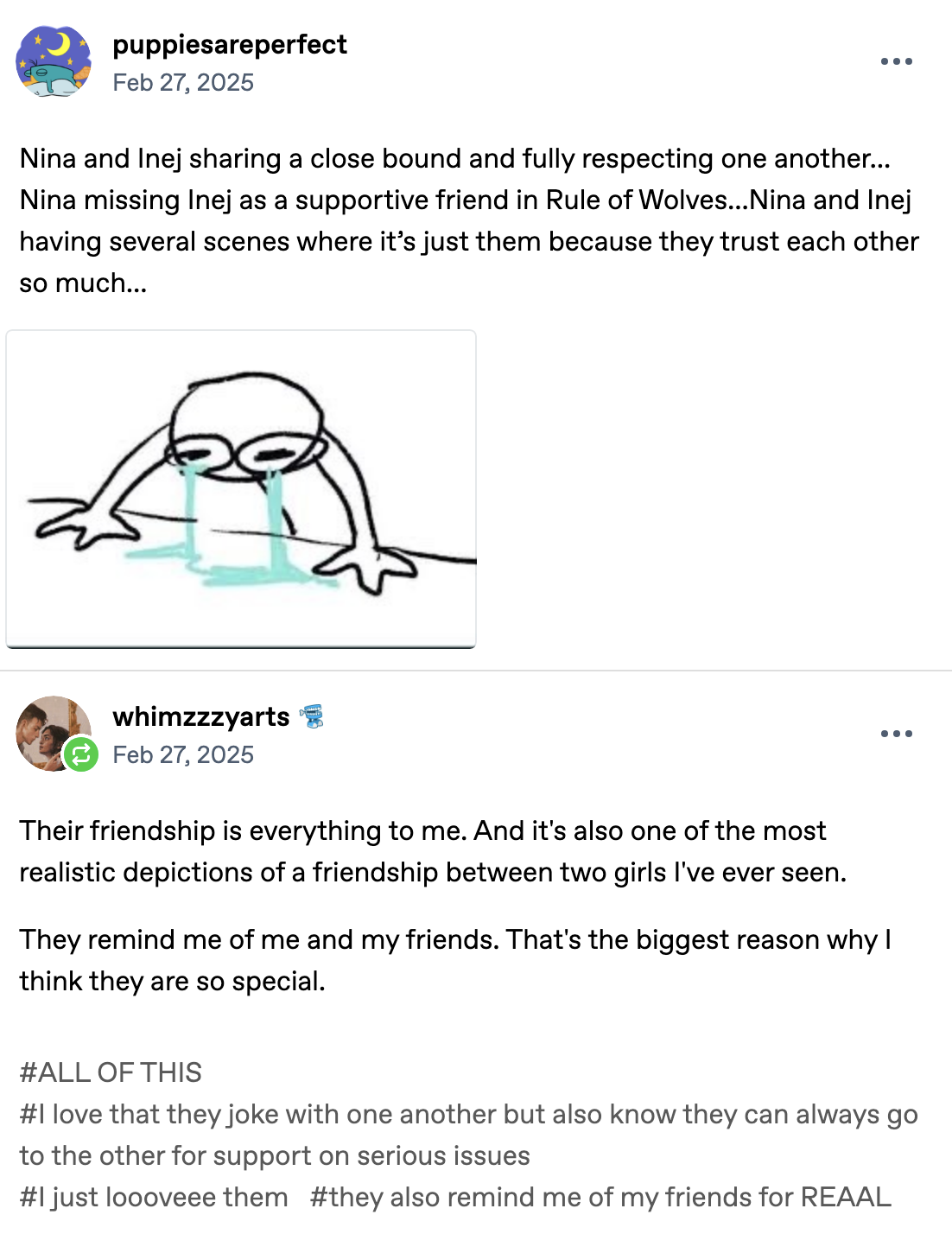 Anyway, her family. I want to circle back to them. It is SO rare that we get to see a character reunite with their family in fantasy stories. In some cases, that is fine. It depends what point the author is making. While Inej's story touches on the terrible injustices young girls can face, her story was never about making her suffer endlessly. I was so happy when I read the end of Crooked Kingdom and realized she was about to see her parents again. She truly got her happy ending. Nothing could make me happier.