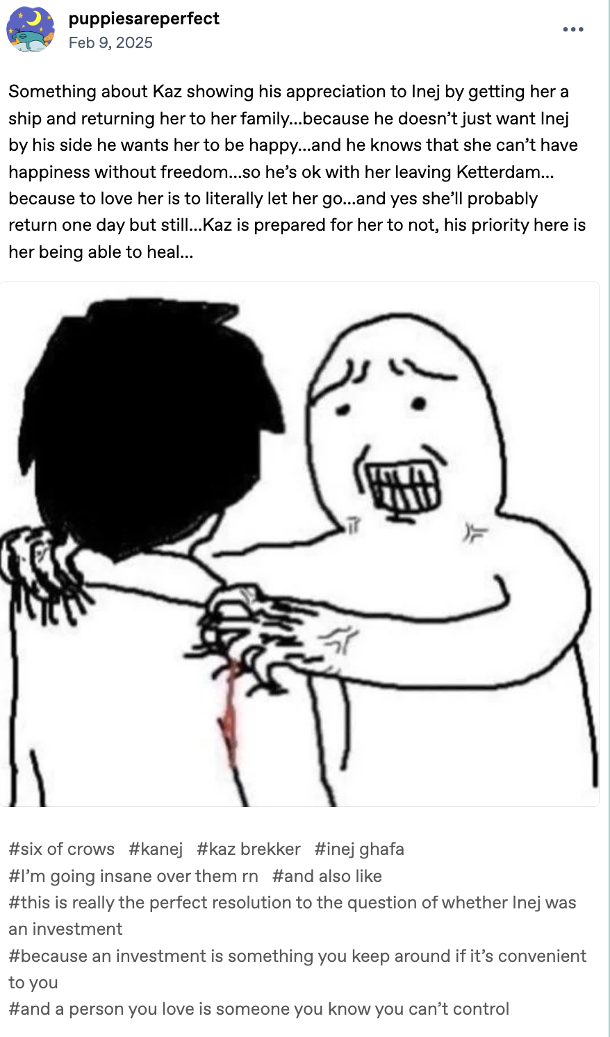 First off, I love the ending that Inej got. Her eventual dream of becoming a sailor and taking down slave ships was, on its own, incredibly powerful--but seeing that dream become reality makes it so much more impactful. I don't think her story would have felt the same if it ended in more tragedy. Her escaping, reuninting with her family, and fighting for other young girls is--in my opinion--the perfect conclusion to her arc. I'm incredibly excited that we're getting a SOC novella soon which is supposed to cover some of her adventures out at sea. This is something I've wanted for a very, very long time. As much as I love Inej's friendship with the crows (as well as what's perhaps a romance with Kaz) I think it's great that we'll get to see her as a leader. It just seems like such a perfect role for her, and I'm excited to see where Leigh takes her chracter next.